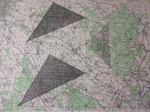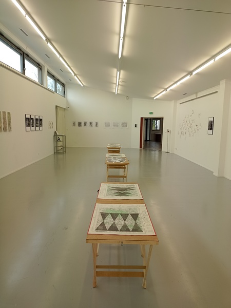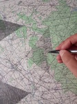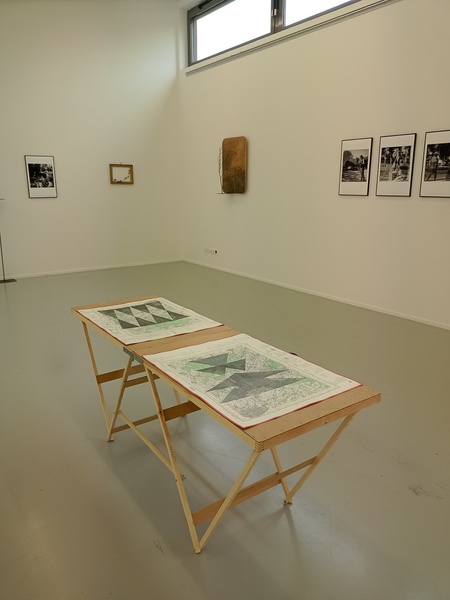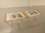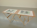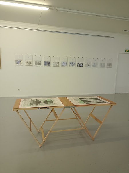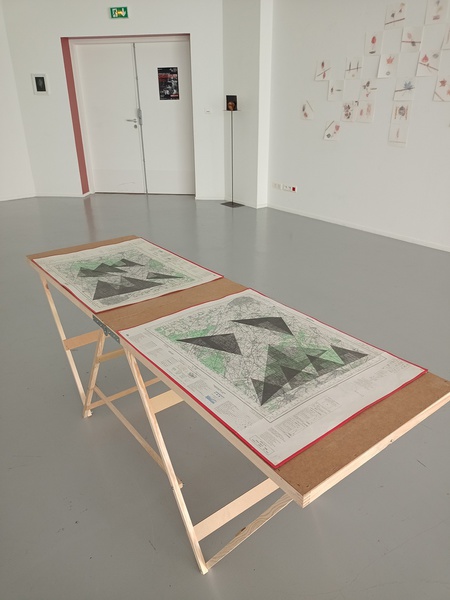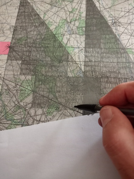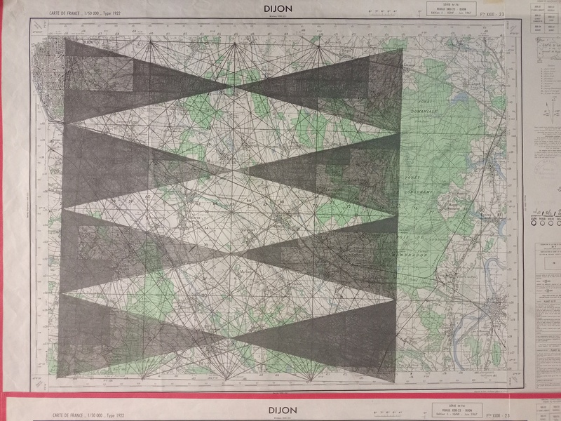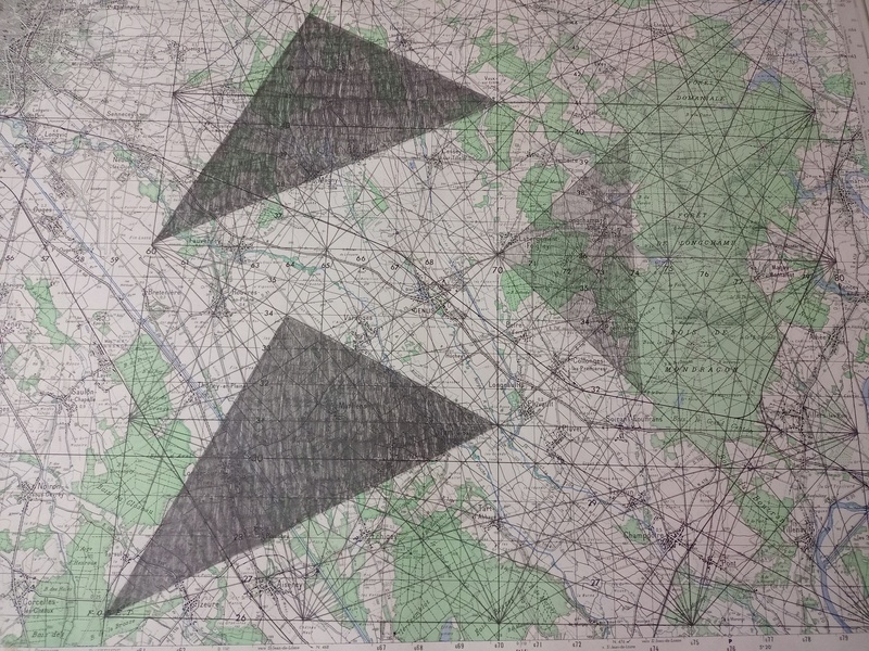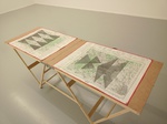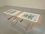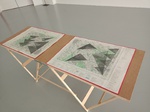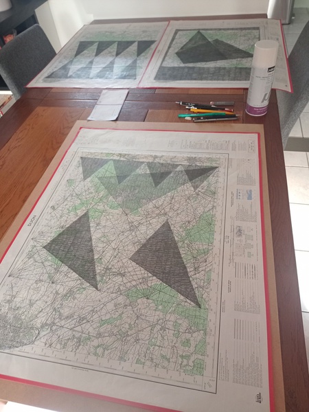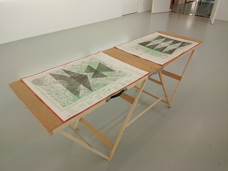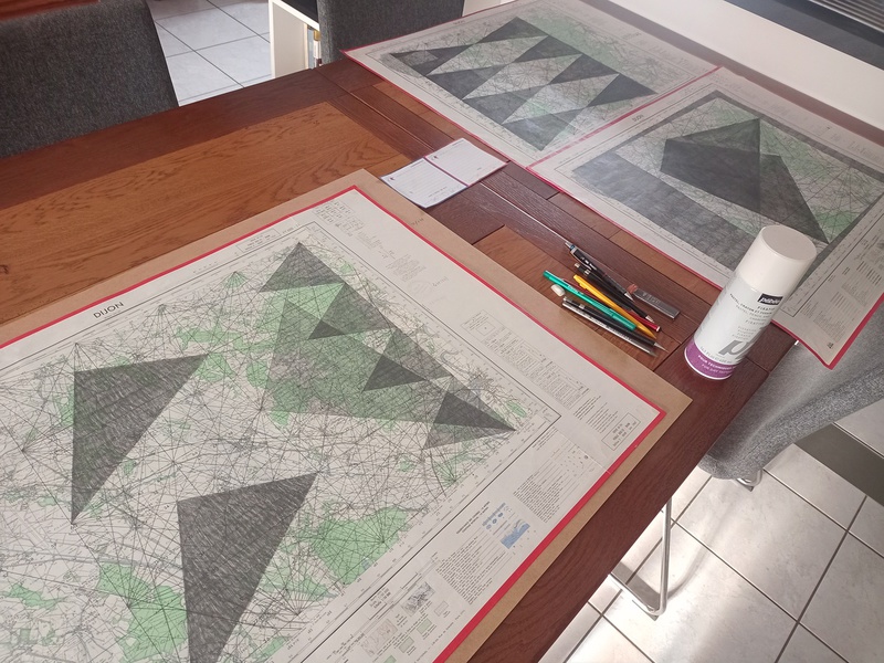 Mine graphite, crayons, fusain, gomme sur cartes topographiques, 70cm x 50cm (x 6) et tables tapissier (X3)
